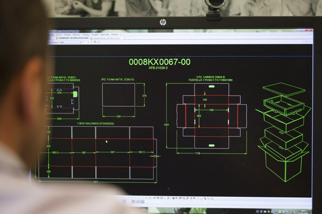 La fase di progettazione rappresenta il punto di partenza di ogni nostro imballaggio. Analizziamo con attenzione il prodotto da proteggere, le sue dimensioni, il peso, la fragilità e le condizioni di trasporto a cui sarà sottoposto. Questo ci permette di sviluppare soluzioni in cartone e legno realmente personalizzate, pensate per garantire la massima sicurezza durante la movimentazione, lo stoccaggio e la spedizione.